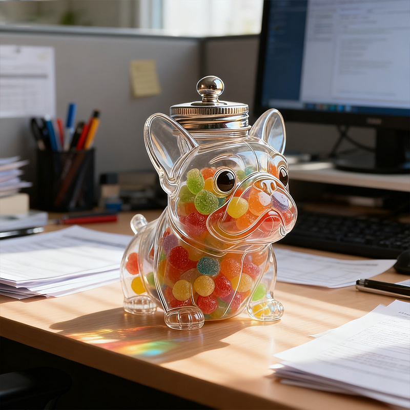 Na stole mám sklenici s motivem francouzského buldočka, plnou bonbónů a pamlsků. Je roztomilá, odolná a nějakým způsobem mi usnadňuje práci. Každý, kdo přijde do mé kanceláře, se na ni chce podívat zblízka nebo se zeptat, kde ji mám. Upřímně, je to můj nejoblíbenější společník na stole!