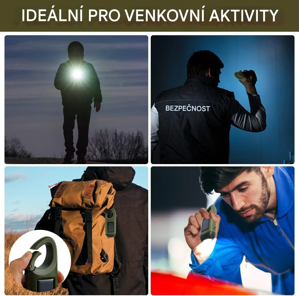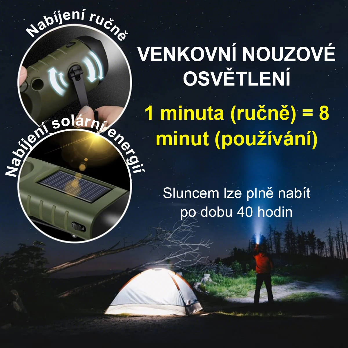 Dobíjecí vodotěsná LED svítilna, solární napájení, přenosná, 12000 mcd, powerbanka