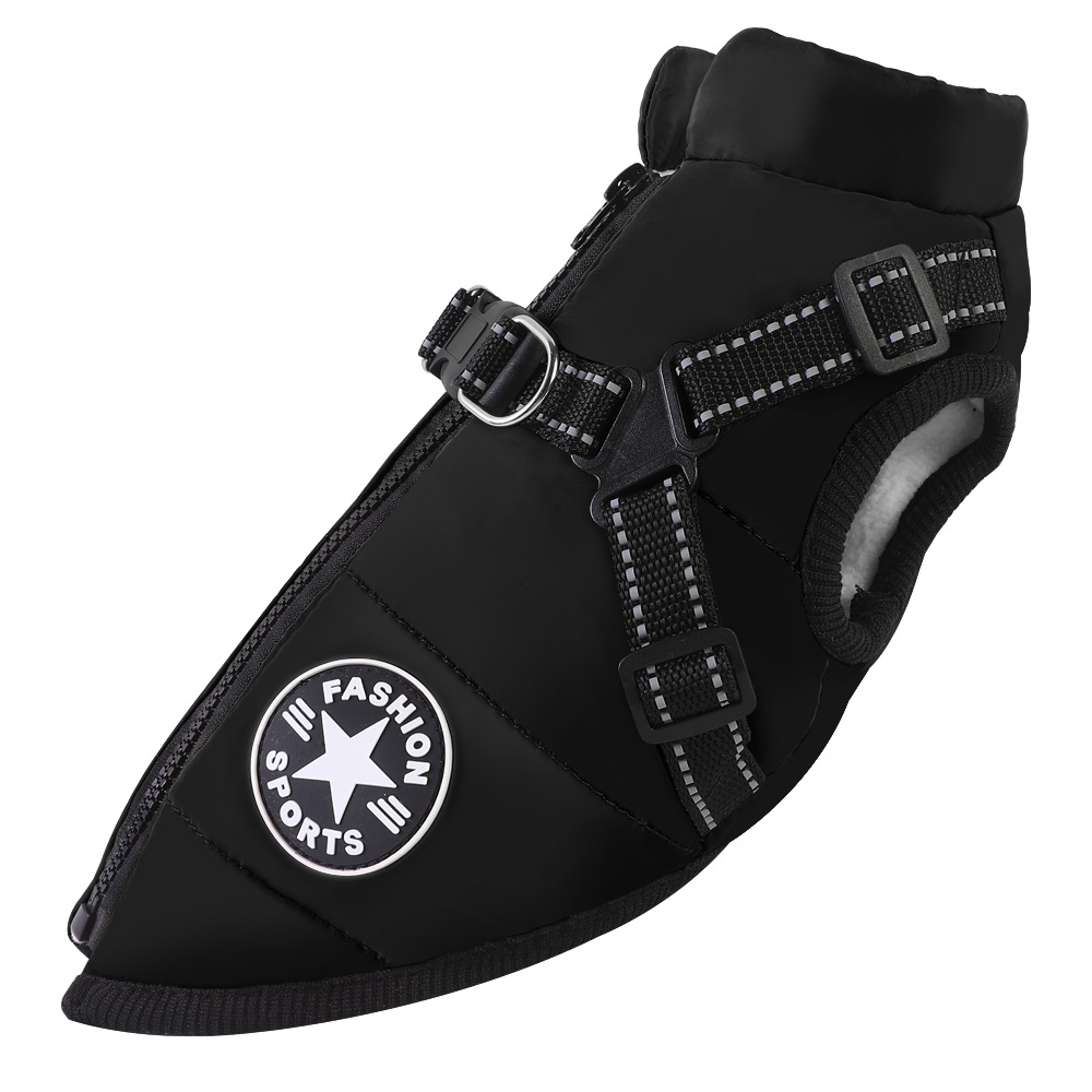 Tohle je skvělý psí kabát! Snadno se obléká, zapíná se na zip vzadu, takže se nemusíte trápit s jeho zapínáním. Fleecová podšívka udržuje vašeho psa v teple. Vodítko se bezpečně připíná dvěma kroužky.