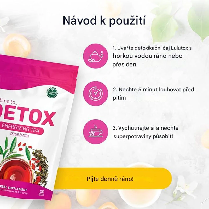 Na rozdíl od silných detoxikačních čajů tento nezpůsobuje nadýmání ani nepříjemné pocity. Dodává mi přirozenou energii a všimla jsem si zlepšeného trávení. Zhubla jsem 1,5 kg za 10 dní – vřele doporučuji!