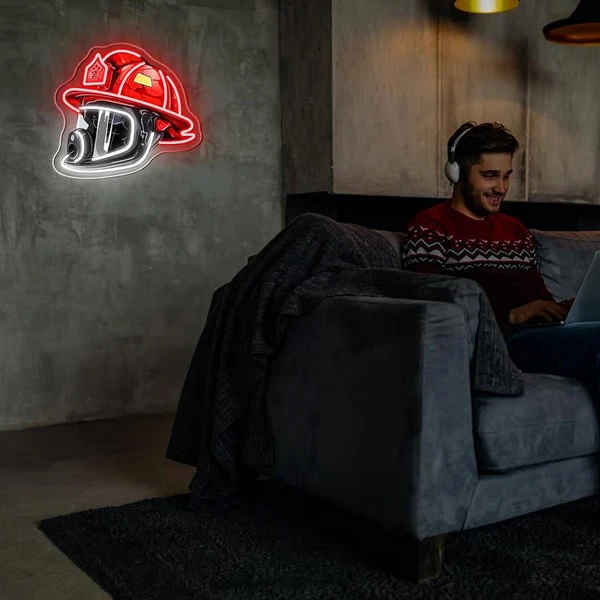 Neonový nápis s hasičskou helmou